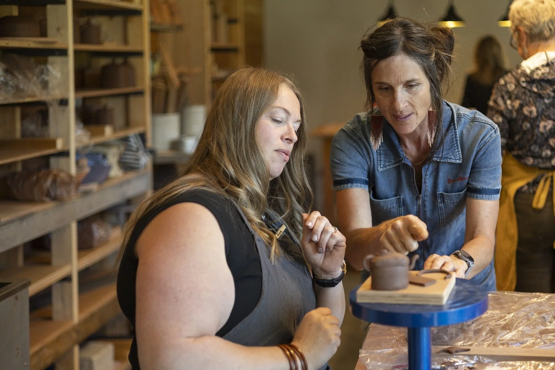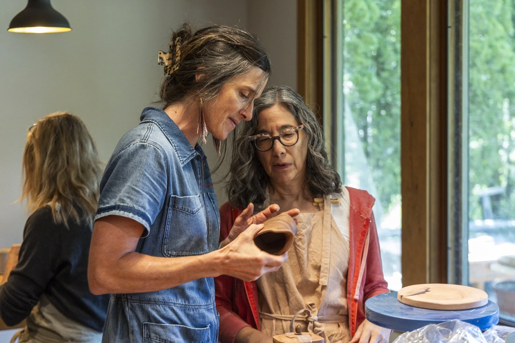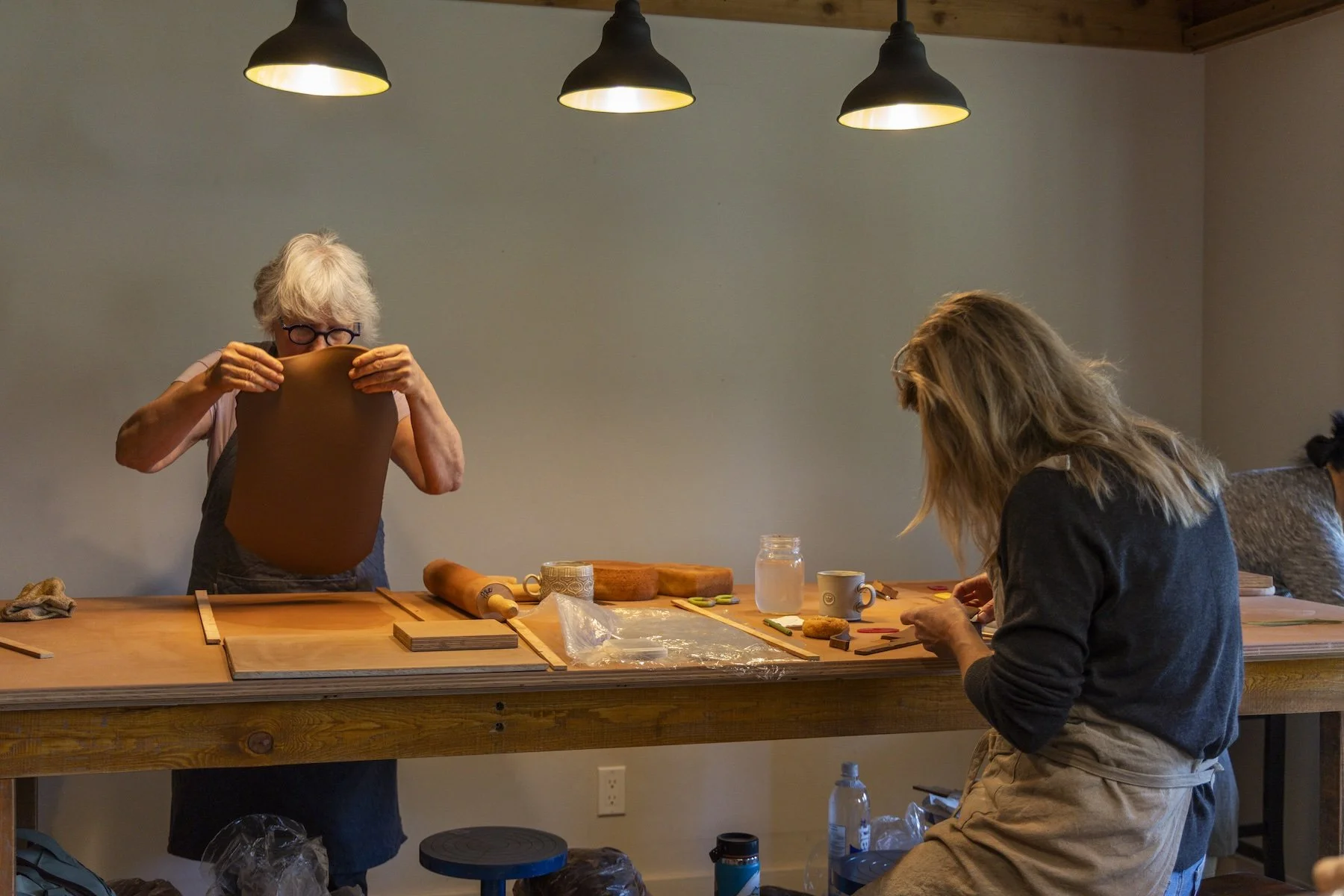 The studio is a bright, welcoming space designed with makers in mind. With multiple solid worktables, two electric kilns, a small glaze kitchen, and plenty of natural light, it’s the perfect place to settle into the rhythm of clay work. When the weather allows, the covered outdoor area offers even more room to spread out and explore. Class sizes are intentionally small, giving each participant ample space and support.