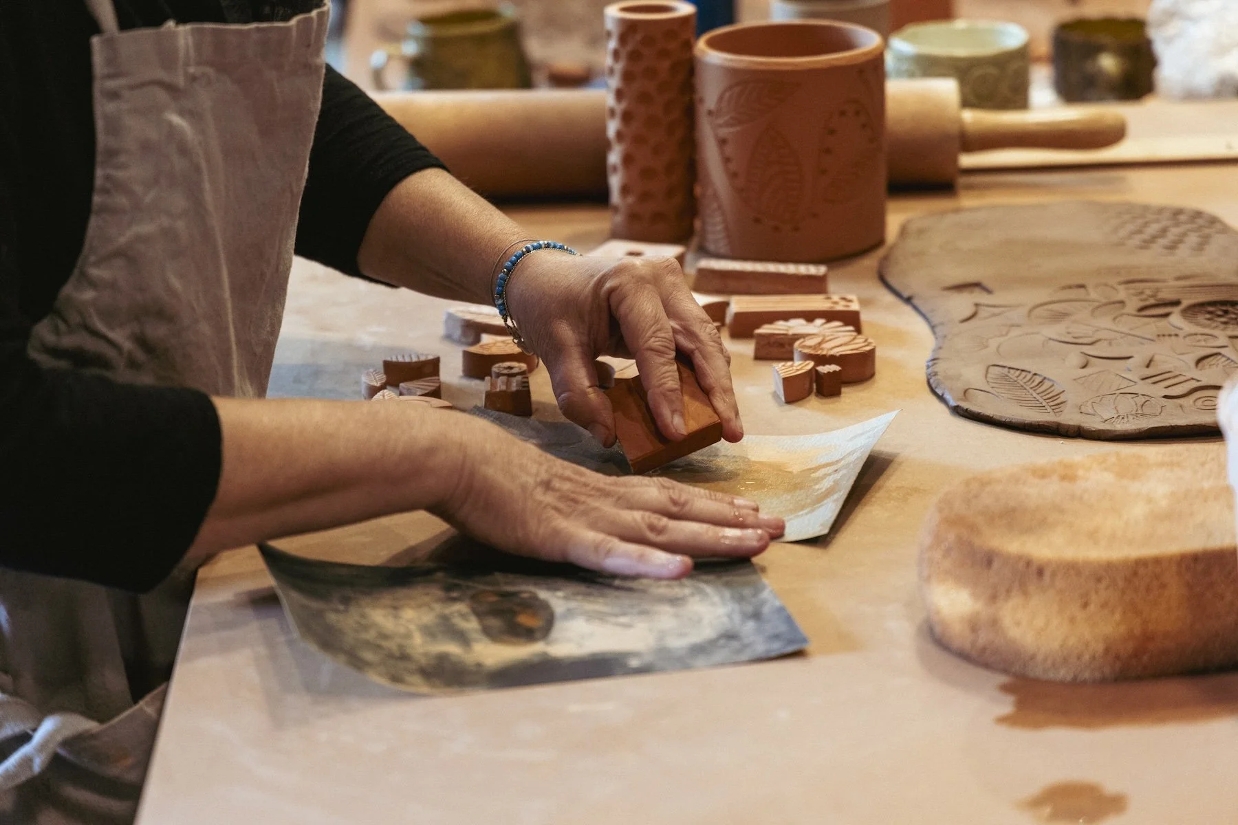 Students will learn how to texture and stamp clay using both hand-carved and found tools, exploring the tactile process of pressing and impressing texture into clay. Through this, they’ll gain an understanding of repeated pattern design and how rhythm, depth, and mark making can completely transform a slab.
